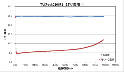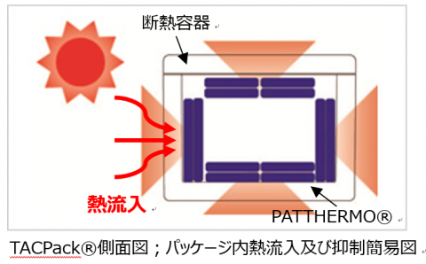 TACPack®(タックパック)は、カネカグループの玉井化成㈱の商品名です。TACPack®(タックパック)は断熱容器により外気からの熱流入を小さくし、更に断熱容器内に搭載したPATTHERMO®(パッサーモ)が移動した熱エネルギーを授受し断熱容器内の温度を一定時間、定めた温度領域を保持することを意図して設計されています(パッケージ内熱流入及び抑制簡易図参照) 。