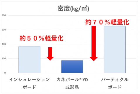 同体積で比較した場合、インシュレーションボードに対して約50%の軽量化、パーティクルボードに対して約70%の軽量化が可能です。